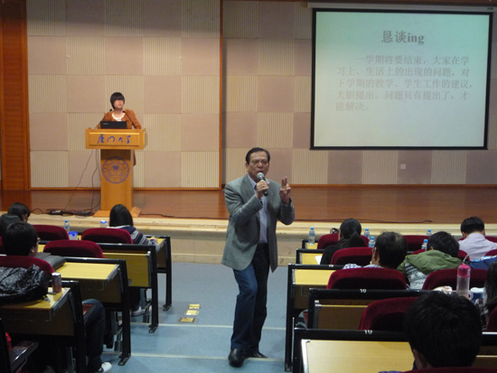 12年12月29日星期六,中午12点30分于主三教学楼小报告厅,举行了环境科学与工程系新学期第三次师生恳谈会。到场的有系主任卢昌义教授、行政秘书兼辅导员张晶老师、全体教师以及10、11、12级环科系学子。