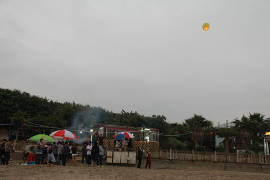 第一天,同学们带着兴奋的心情出发了,一路上欢声笑语一片。为了此次的出游,班委们安排十分细致。食宿方面安排的舒适细腻。渐进黄昏时候,同学们开始七手八脚地准备晚饭。这是一次愉快的野炊,曾厝�的沙滩上,阵阵香味缭绕,同学们自己动手做烧烤,老师和同学们打成一片,其乐融融。远处,同学们三五成群:有的放风筝,有的吹泡泡,有的在烧烤,有的在放着孔明灯,还有的光着脚丫在沙滩上散着心……孔明灯啊,你承载的光芒正是我们的美好期盼。时光这么美,怎舍得让同学和老师的情谊分开。