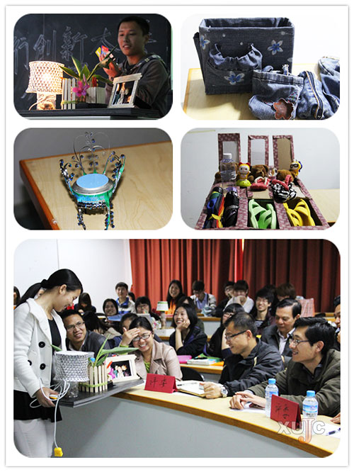比赛中,同学们结合PPT,从创意来源、制作材料、作品功能和制作成本四个方面介绍了各自的作品。这些精美的作品创意大多来源于日常生活,取材于废弃物品,体现了环保理念。