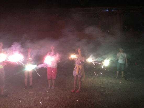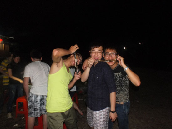 夜晚的时光更加烂漫。露天烧烤的时候,同学们互相分享自己烤好的食物,拍照的闪光灯更点缀了充满了欢声笑语的和谐画面。绚丽的时光可没有早做准备。整个景区突然停电了,就在一片漆黑时候,蔡英杰同学刚好买回了仙女棒和烟花,点亮了整个景区。同学们疯玩起来,旁边的店家受到感染,拿出了两个大烟花为同学们助兴。在璀璨的烟花中,映出每个同学欢欣的笑容,那一刻定格在同学们的脑海中,久久不散。