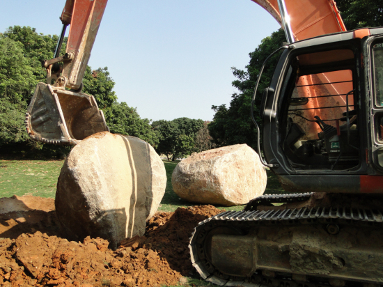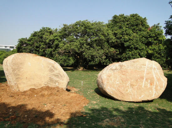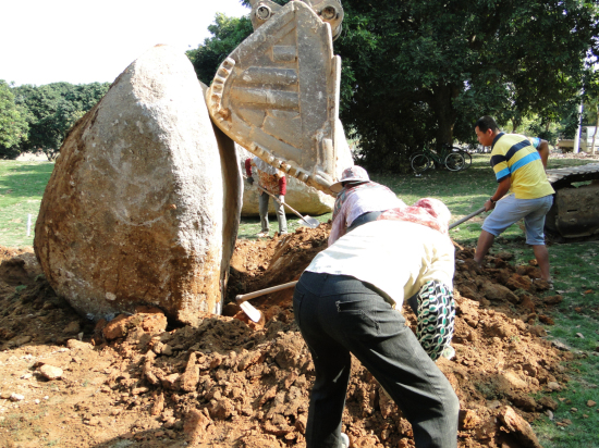 两座石刻的基石是由环境科学与工程系的老师们多次前往招银开发区内的山地精挑细选所得,外形匀称壮观,重量均在30吨以上,是目前校内最大的两块石刻。也因如此,石头的搬运过程费尽周折。负责搬运的工程队出动了大型起重机、平板拖头车、挖掘机、和大量工人,历经数天探讨方案,最终花费数十小时才将石头运进校区、并安然无恙地摆正立起。而后,系里又请来了工艺精湛的惠安石匠进行雕刻,以保证石刻的艺术水平。截至目前,石头的雕刻工作已经基本完成,等待着校庆大幕开启时,被掀起红盖头露出真面目的那一天!