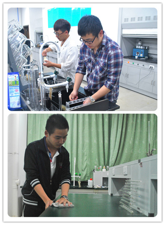 实验室放着令人轻松的流行歌曲,大家伴着歌曲开心的忙着自己手中的活,有的同学在清洗实验器材,有的同学擦着实验台,有的同学负责扫地和拖地,还有的同学将实验器材和实验药品进行归类整理。到处都是同学们忙碌的身影,使寂静的实验室充满了生机。
