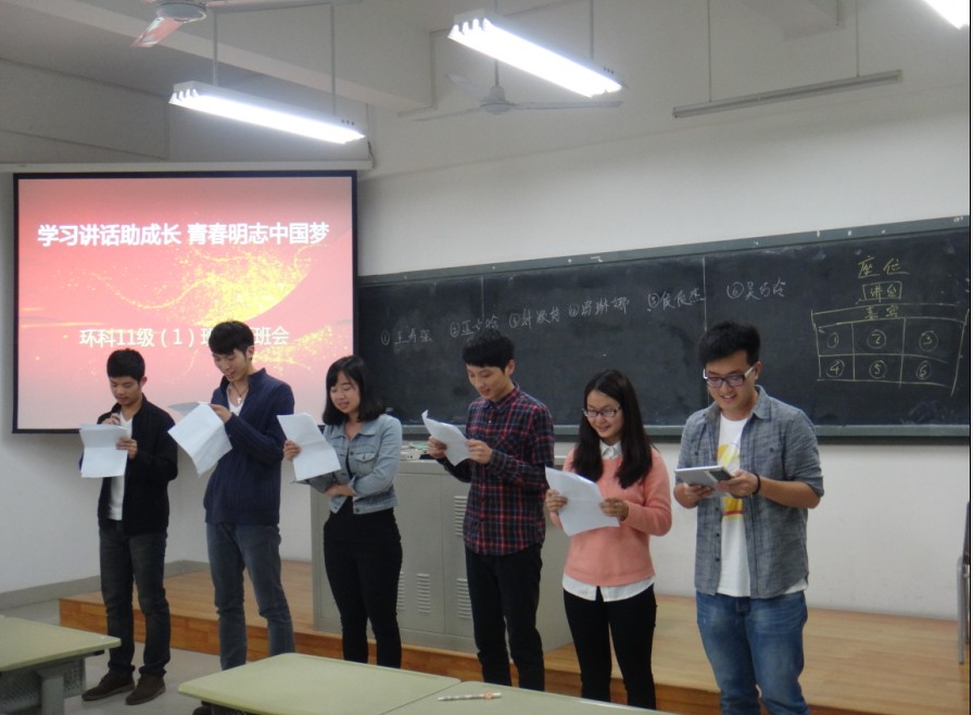 2013年5月7日中午,环科系2011级1班的同学们在班干部及班内党员的组织下,于经管楼2楼219教室,开展了一场气氛热烈的主题班会——“学习讲话助成长,青春明志中国梦”。