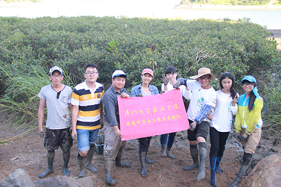 一整天的体力劳动也阻止不了Green Wall暑期社会实践队完成任务的喜悦心情。郑雅欣同学激动地说:“我们终于种完树苗了。”大家身上还都粘着深灰色的泥巴,衣服都湿透了。林娴慧同学汗如雨下来不及擦汗就由衷感慨着:“再大的困难,再大的太阳,也阻止不了GW团队的坚持。”此刻,我们拉起了队旗用相机把我们这天的辛勤劳动珍藏起来。接下来,我们又前往第一个种植区域,检查树苗经过海水的涨潮冲刷后是否还能扎根泥滩。我们开心的发现,树苗依然笔直地站立在泥滩上,坚持守护着自己的一片泥滩。