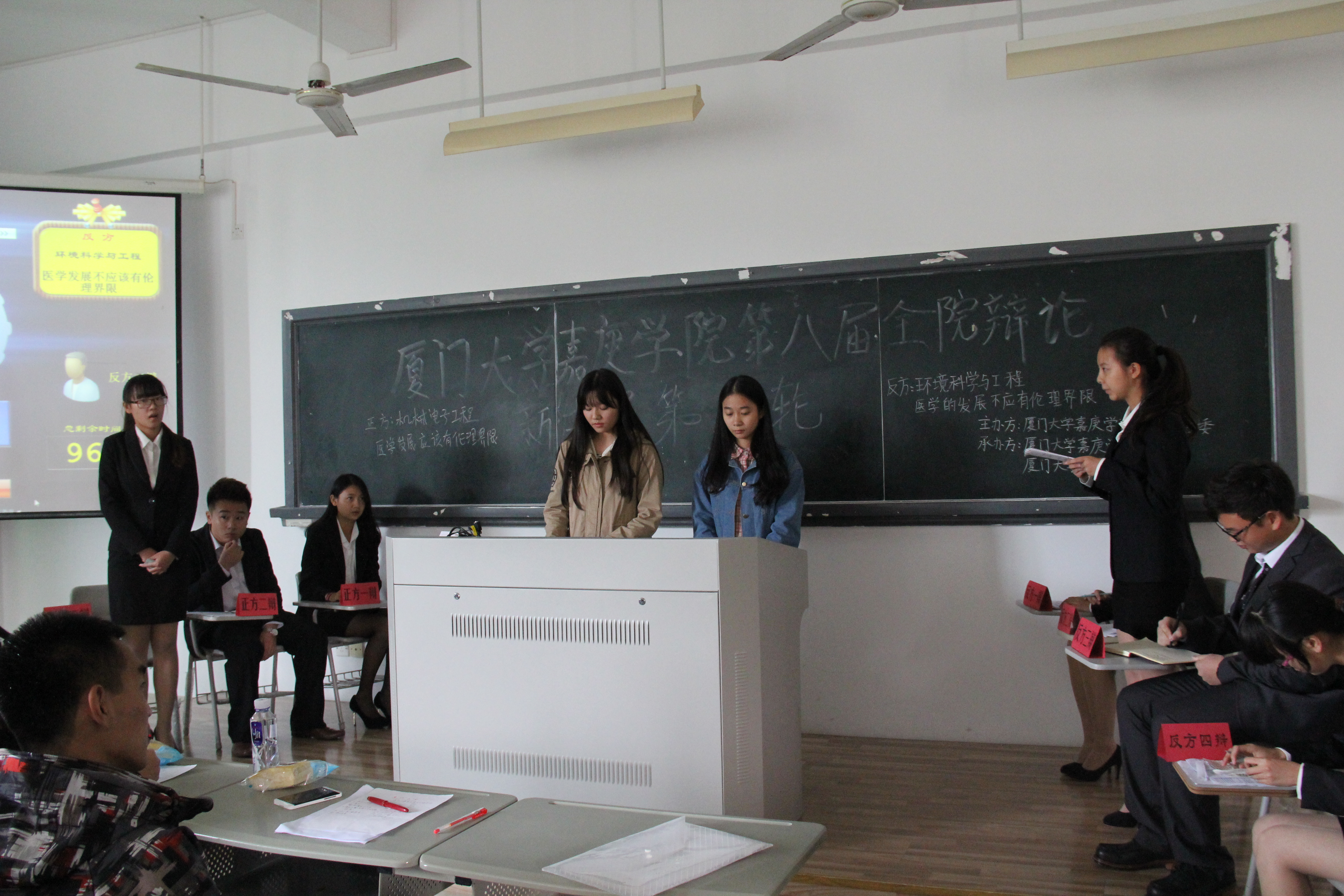 2014年12月4日星期四中午12:00在公一#317展开了厦门大学嘉庚学院第八届全院辩论新生赛复赛。此次辩论赛正方是立场为医学发展应该有伦理界限的机电系,反方是立场为医学发展不应该有伦理界限的环科系,双方辩手在自我介绍时声音的洪亮体现出他们的有备而来和信心十足。