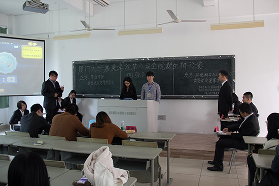 12月11日中午,厦门大学嘉庚学院全院新生辩论赛四强争夺赛在公一#119举行。参加此次比赛的我系的辩论二队和管理学院代表队围绕“接受现实更需要勇气还是改变现实更需要勇气”展开了精彩的辩论。担任此次比赛评委的是法学院辩论队队长、建筑系辩论队队长和会计系辩论队队长。
