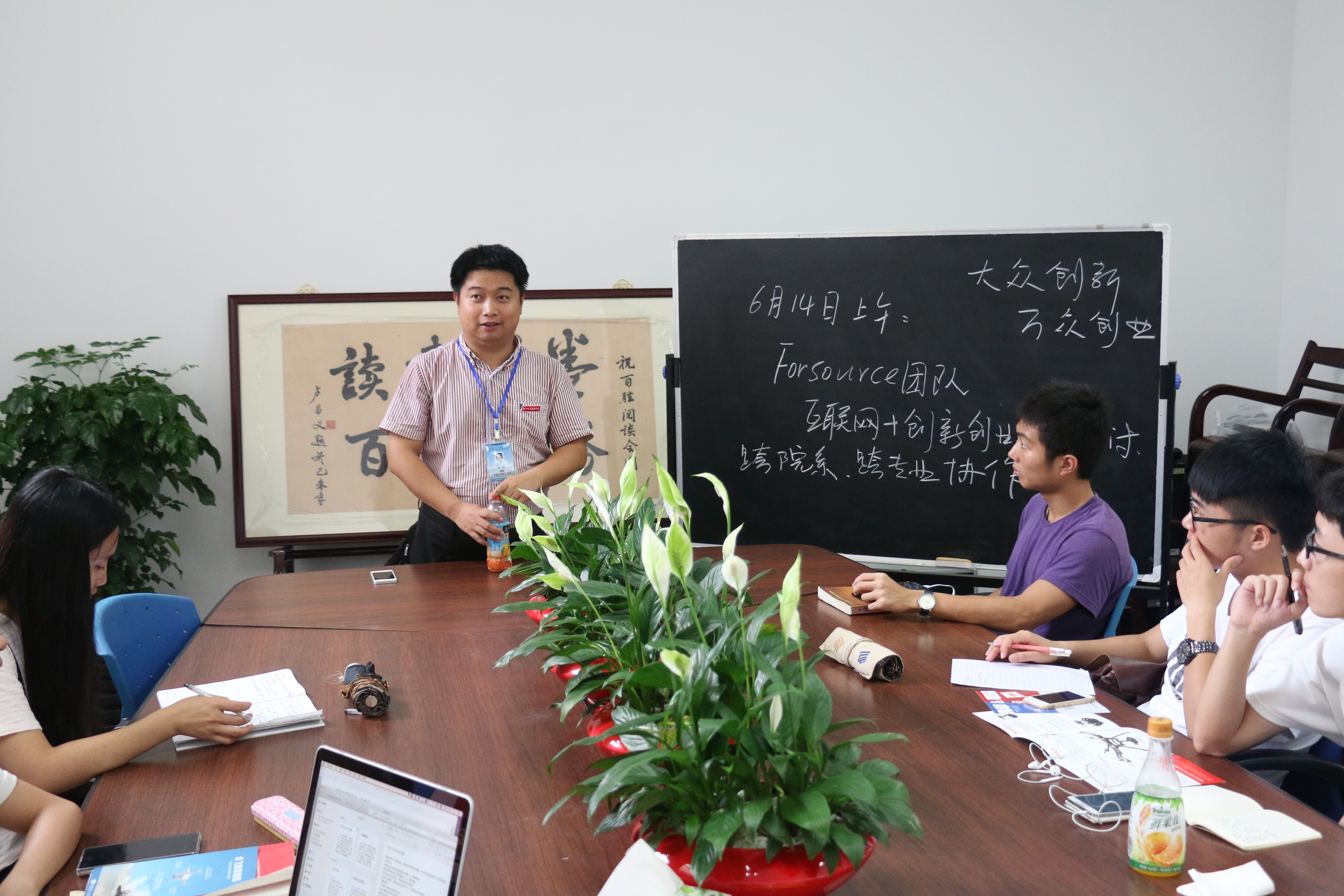 经过精心布置,现在室内已绿植繁茂、蓝图初展,电脑、投影仪等设备一应俱全,卢昌义教授“读书万卷、百战百胜”的寄语使得室内儒雅与现代氛围更添辉彩。据悉,该平台已吸引十多支团队参与研讨分享,并有多位专业教师莅临指导,“分享阅读体验、开展主题研讨活动”,欢迎更多的团队和朋友加入我们,分享研讨!