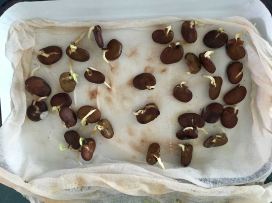 操作:将蚕豆铺展在实验铁盘中,用白纱布盖住,进行为期4天的浇水培育,蚕豆终于长出新芽啦。凡事过犹不及,若水加多了, 蚕豆宝宝发霉死了。