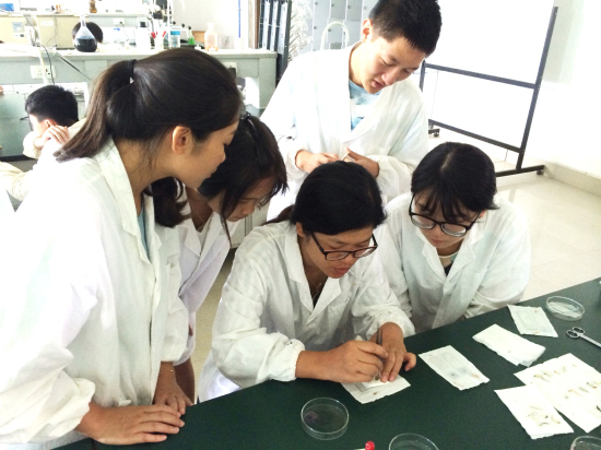 同学们聚精会神看着周细平老师示范染色压片的操作,她边操作边解释:先剪下根尖1-2毫米,置于载玻片上,先滴染液后盖片,最后轻轻将根尖捣碎成雾状式薄片。