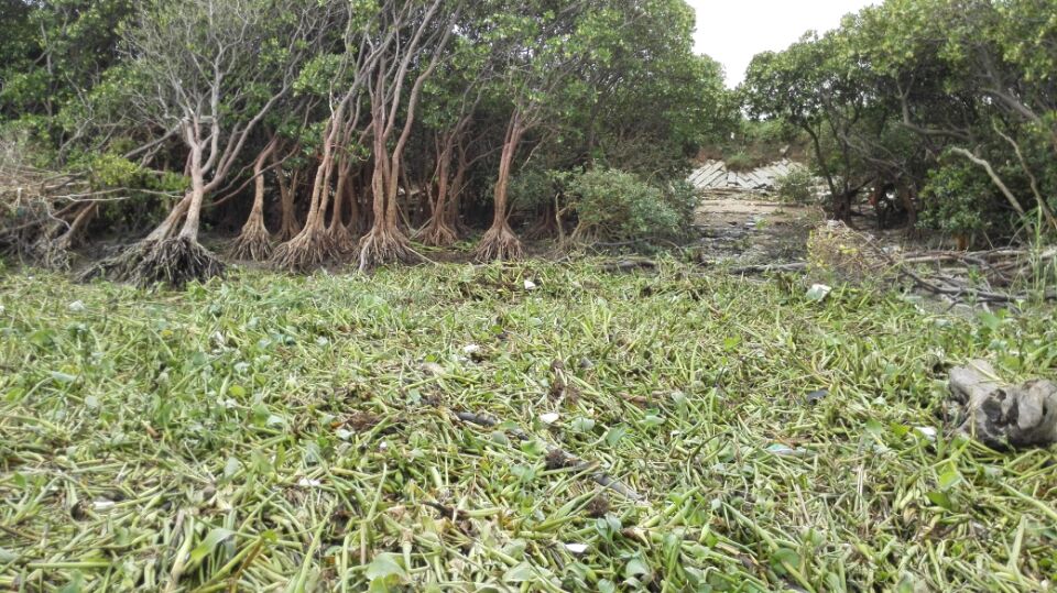 调查过程中,队员们发现几个现象。九龙江滩涂上堆积着大量的凤眼莲,就是我们俗称的“水葫芦”,水葫芦中间还夹杂着一些垃圾和鱼类的尸体。周细平老师解释说,由于连日的暴雨,把九龙江上游的水葫芦冲刷到海门岛的潮间带搁浅造成的。