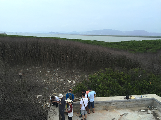 8月26下午,在得知甘文红树林某个区域区内红树林发生莫名死亡的消息时,金亮老师立即带着暑期社会实践队Rubber.D团队的两名成员赶往浮宫林业站了解情况,与林业站薛志勇工程师一番交流后,一同前往甘文红树林灾害发生点进行实地勘察、采样。