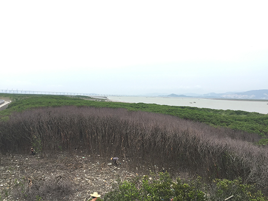 期间,漳州林业局局长以及一干专业人士也前来红树林地区勘察情况。金亮老师在实地考察时,发现枯死的秋茄树枝内生有一种害虫,树木均从顶头往下掉叶,紧接着是脱皮,之后整棵树枯死,且有往外扩散的趋势。经过与林业局局长及其他人士的讨论之后,初步诊定为病虫灾害。