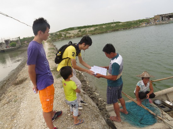 13日上午,厦门大学嘉庚学院环境科学与工程系暑期社会实践队Rhythm & life团队来到海门岛向养殖户反馈上次来实地采样的鱼塘水质的检测结果。