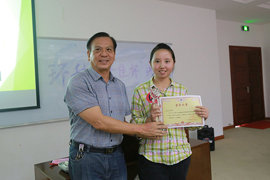 最后进行的就是统分环节了,在统分的过程中,14级给排水的杨一�同学和15级环科的陈永庆同学为大家献上了一首《情歌王》,随后,系主任卢昌义也为大家现场献上一首《月亮代表我的心》,而且将“一个吻改成了几百个吻,“一段情”改成了“四年情”现场气氛达到高潮。接下来就是更加激动人心的时刻了,主持人在大家的期待中公布了最后的结果。最后胡煜昕同学以18.375的高分夺冠,王雅茹同学夺得二等奖,伍启瑜、刘可鑫和原晨雪获得三等奖。卢主任及嘉宾们为获奖同学颁奖并合影留念。