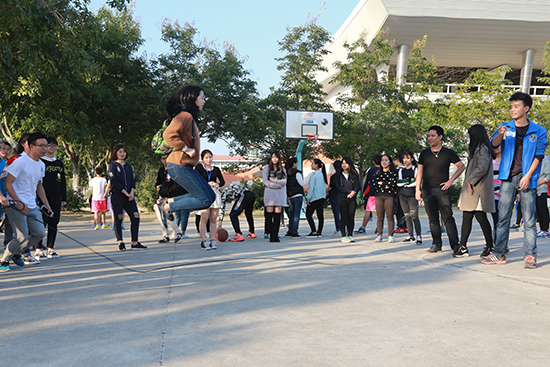 最后一个项目是“8”字跳绳,是由两名同学在两旁摇一根很长的绳子,同学们排好队从一边接连的跳过去,在相同时间内跳过去的同学最多组获胜。