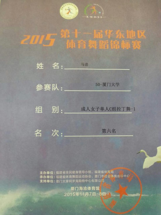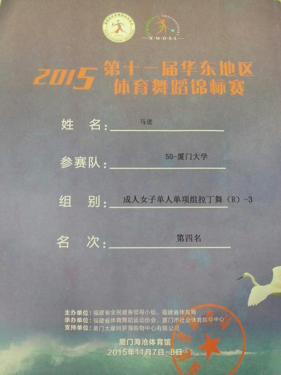日前,第十一届华东地区体育舞蹈锦标赛在厦门海沧体育馆落下帷幕。我系学生马进获得成人女子单人单项组伦巴第四名和成人女子C组第六名。