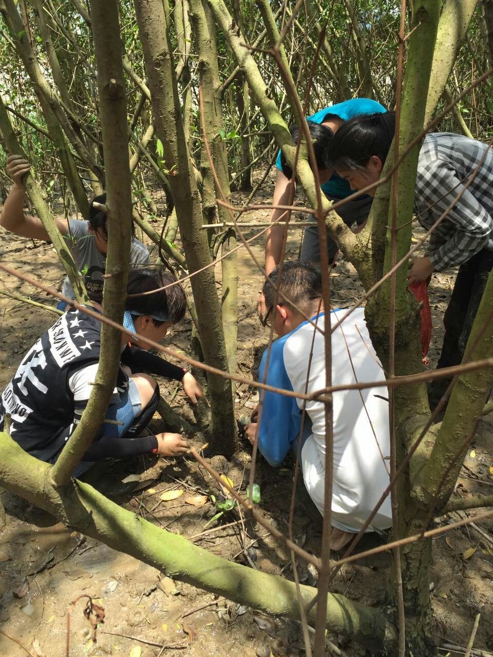 在红树林内种植并不是一件简单的事情,首先要越过一堆浸泡着生活垃圾的污水才能到达林内,然后在林内还要保持重心稳定以防摔倒,更不用说还要进行插苗。但是所有人都不怕苦不怕累坚持了下来。志愿者们两两分配一个递苗一个插苗,种植紧张有序的进行着。环境保护协会红树林组也不懈怠,他们用实际行动为志愿者们做好表率工作。不少志愿者由于第一次下红树林泥潭,泥潭中存在不少的螃蟹及跳跳鱼,带着好奇在闲暇的时间抓着螃蟹玩。