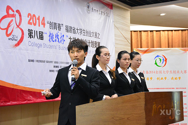 大学期间,蔡英杰参加了十余次竞赛,捧回了多个奖杯。在第八届“挑战杯”福建省大学生创业计划竞赛决赛中,他所在的“Green Style”团队获得金奖,在接下来的国赛中获得银奖。图为蔡英杰在省赛决赛中介绍团队项目。