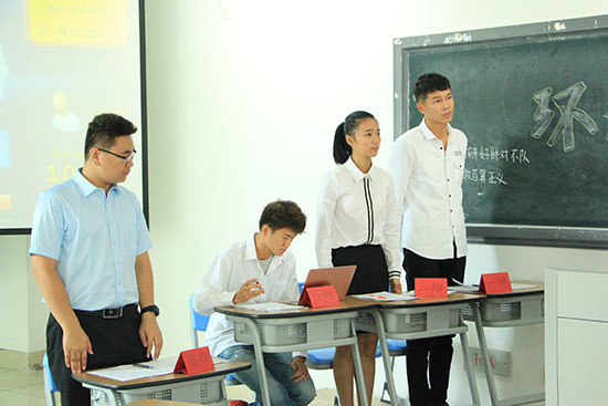 在台下带队辩员的指导环节过后,迎来了高潮部分——自由辩。反方二辩率先强调了杀一救百对社会影响大,正方不甘示弱,反驳道:死一百个人与死一个人,哪个对社会影响力大呢?反方三辩再次抛出问题:不得不杀人就可以杀人吗?正方再次反驳道:杀一救百的前提是“救百”。双方你攻我守,高潮迭起。紧张的自由辩后,双方四辩各自严谨地总结陈词,为这一场没有硝烟的激辩画上了圆满的记号。