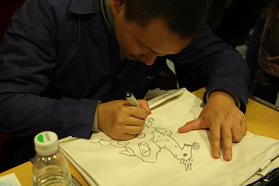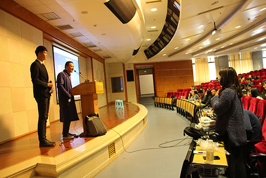 在简单的开场吉他演奏后,讲座开始。陈花现老师先是介绍了他的设计之路的成长历程。他21岁成为厦门著名设计师林宇鸣先生的设计助理,24岁尝试成为自由职业插画师,并用自己的努力在26岁迎来绘画人生的小高潮。同时介绍了自己目前的主要工作:插画和收集厦门老城区的历史。之后花现老师通过PPT向同学们展示了他的一些优秀作品,比如兔子商贩,充满雕花的瓷器。同学们对这些趣味十足又充满了文化气息的画作赞赏不已。