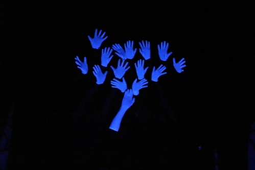 踏着欢快的节奏,身着美丽的红裙,首先是由国际舞协会带来开场舞《节日欢歌》,为晚会拉开帷幕。男声雄浑,女声柔美,第一个节目一曲《中国范》就此献上,唱出了儿女们对祖国的深深热爱。其次是由16环科2班团支部带来的《黑光手舞:夜空中最亮的星》,独具匠心,带领现场观众走入星光天地,“16HK”、“2017”、“TKK”等等这些都是他们用发光的手语在黑暗中向观众传递的语言,灯与手舞的结合,靓丽的造型,牢牢锁住场下观众的眼球,光影中奇妙的变化让人眼前一亮。