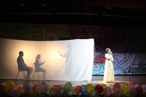 第三个节目是16法学2班团支部的话剧表演《玲儿想丁当》,该话剧以轻松诙谐的方式演绎了抗日战争中一段凄美婉转的爱情故事,捧腹不已的同时也令人唏嘘。接下里是16行政管理团支部演绎的《舞台情景剧:送归》,白色幕布背后的影子简述了送君,学堂学习等生活情景,生动表达了青年爱国心在成长过程中越发炽热的过程,该剧最后幕布一卸,转而进入合唱《国家》,气势磅礴地唱出了青年队祖国母亲的热爱与赞美。
